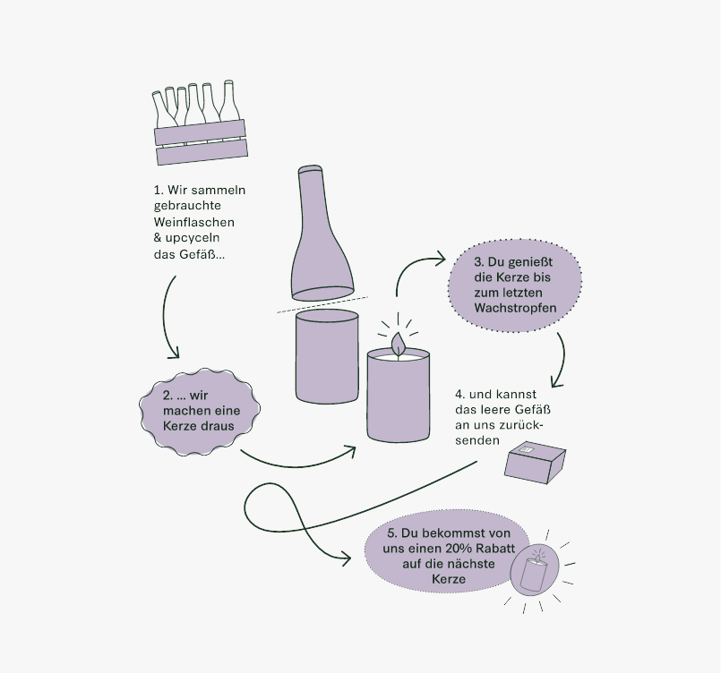 Kerzengenuß und gutes Gewissen, dass ist Kerzenssache! Endlich kannst Du so viele Kerzen genießen wie du willst und vermeidest damit nicht nur Müll, du reduzierst ihn sogar! Geb uns deine ausgebrannten Kerzen, wir machen Neue draus und du bekommst einen Rabatt! Nachhaltiger kann Kerzengenuß nicht sein